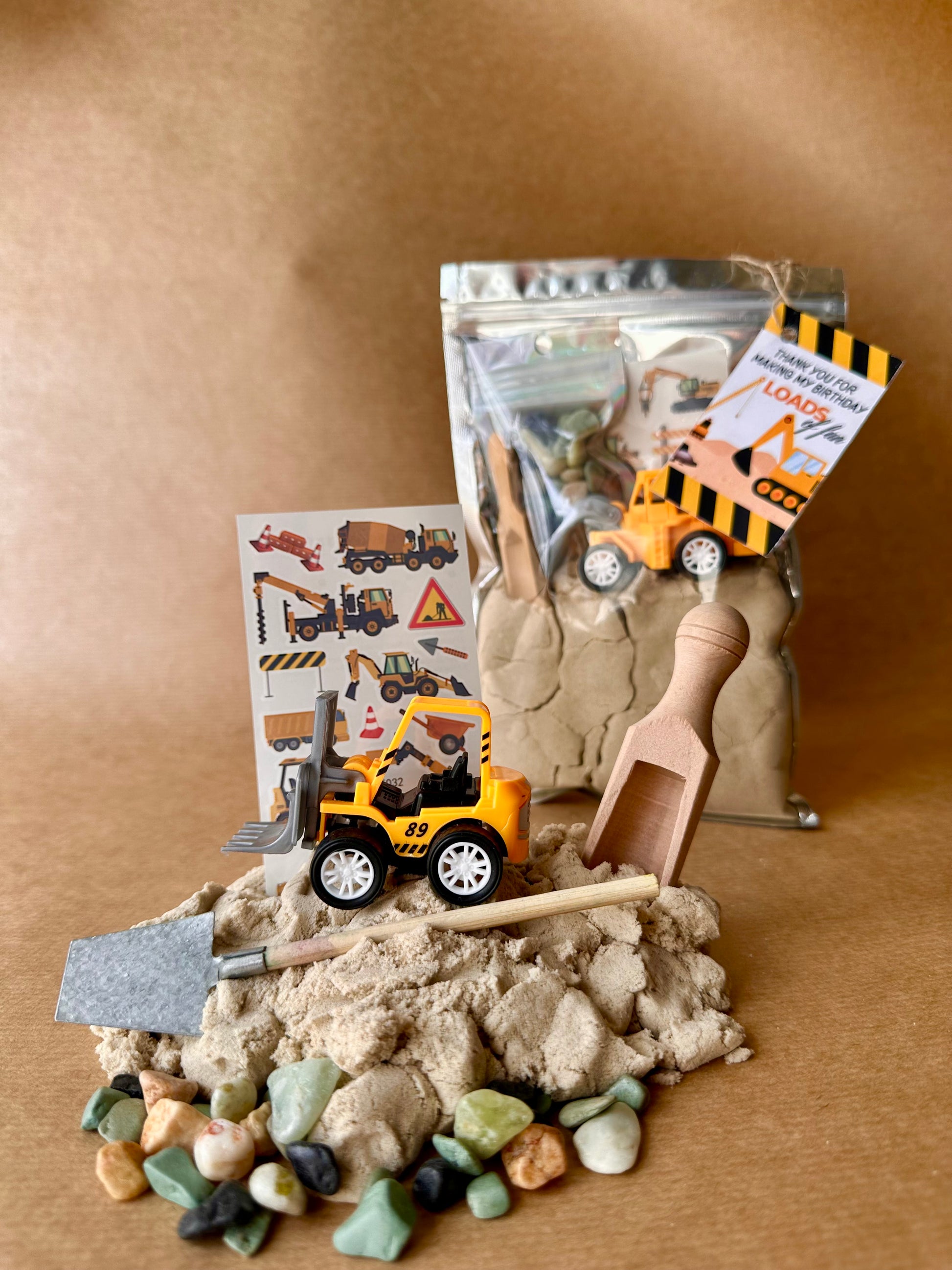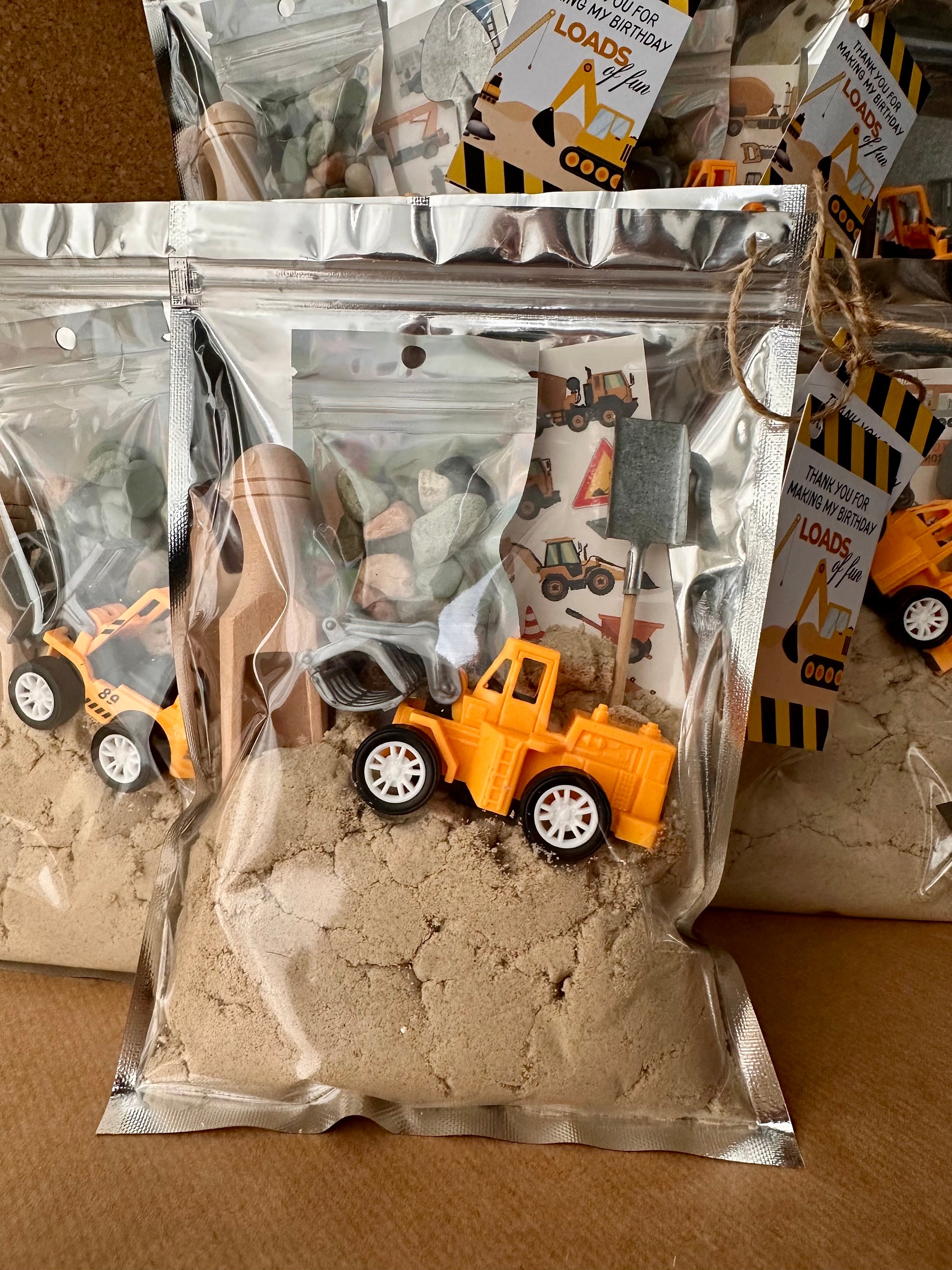π§ Dig into the fun with our Construction Party Favor Bags! ππ¨ Packed with everything little builders need: soft kinetic sand, a toy truck, a mini shovel, a wooden spoon, construction-themed tattoos, and tiny pebbles for the ultimate sensory play experience! ποΈπ